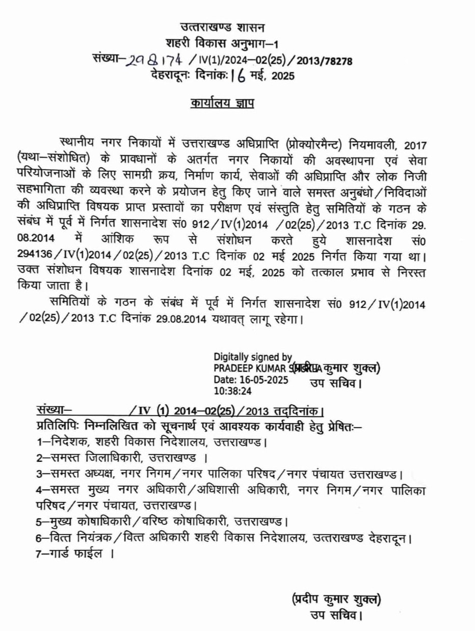 स्थानीय नगर निकायों की अधिप्राप्ति व्यवस्था (Procurement System) से संबंधित एक महत्वपूर्ण निर्णय लेते हुए दिनांक 02 मई, 2025 को निर्गत शासनादेश संख्या 294136/IV(1)2014/02(25)/2013 T.C को तत्काल प्रभाव से निरस्त कर दिया है। यह आदेश नगर निकायों की अवस्थापना एवं सेवा परियोजनाओं हेतु सामग्री क्रय, निर्माण कार्य, सेवाओं की अधिप्राप्ति एवं लोक-निजी सहभागिता (PPP) के तहत की जाने वाली निविदाओं व अनुबंधों के परीक्षण एवं संस्तुति के लिए गठित समितियों के गठन संबंधी पूर्ववर्ती आदेश में संशोधन करता था।