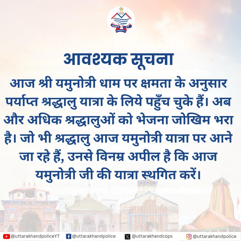 उत्तराखंड पुलिस ने ट्वीट कर श्रद्धालुओं से यमुनोत्री धाम की यात्रा रविवार को स्थगित करने की अपील की है। उत्तराखंड पुलिस के मुताबिक श्री यमुनोत्री धाम में क्षमता के अनुसार श्रद्धालु यात्रा के लिए पहुंच चुके हैं अब और अधिक श्रद्धालुओं को भेजना जोखिम भरा है। उत्तराखंड पुलिस ने रविवार को यमुनोत्री यात्रा पर आने जा रहे हैं श्रद्धालु से अपील की है कि यमुनोत्री जी की यात्रा स्थगित करें।