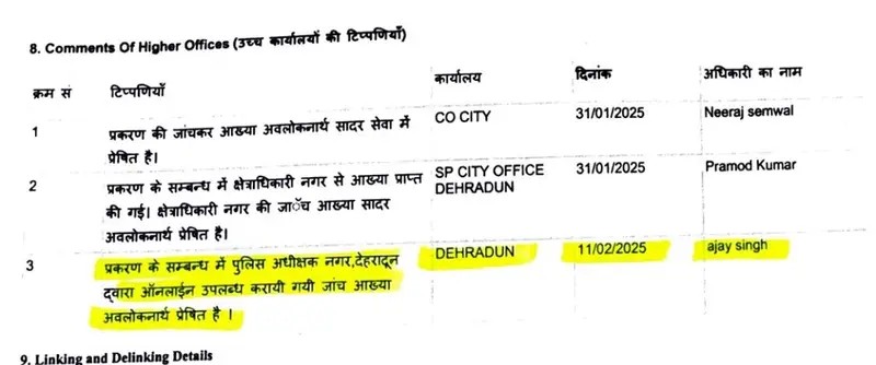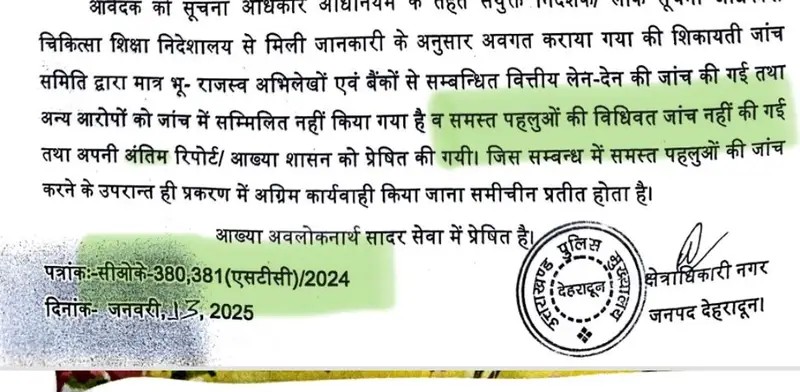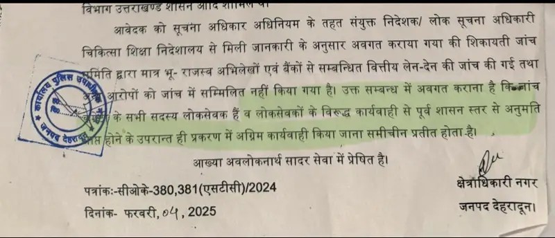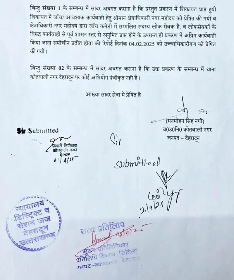 देहरादून के माननीय सी जी एम कोर्ट में गौतम बुद्ध सुभारती मेडिकल कॉलेज में भ्रष्टाचार के एक मामले में उत्तराखंड के चार अधिकारी जिनमे अपर सचिव,उत्तराखंड शासन अरुणेंद्र सिंह चौहान,वित्त नियंत्रक विवेक स्वरूप, अपर जिलाधिकारी देहरादून के के मिश्रा और निदेशक, चिकित्सा शिक्षा डा आशुतोष सयाना के विरुद्ध माननीय CJM न्यायालय द्वारा आदेश के बाद कोतवाली देहरादून से दिनांक 2.4.25 (2 अप्रैल 2025) को रिपोर्ट प्राप्त हुई (1) “ इसमें कोई FIR दर्ज नहीं है “(2) माननीय क्षेत्राधिकार नगर महोदय को प्रेषित…रिपोर्ट दिनांक 4.2.25 उच्चाधिकारियो को प्रेषित की गई और उक्त पुलिस क्षेत्राधिकारो की जांच रिपोर्ट की प्रति न्यायालय में दाखिल की जिसमे माननीय न्यायालय द्वारा पुलिस को प्रकरण में प्रारंभिक जांच के आदेश दिए गए है ।
